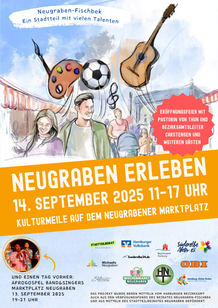Auf der Kulturmeile präsentieren sich lokale Vereine, Künstler und Initiativen. Neben musikalischen Darbietungen sind sportliche und kreative Angebote geplant. Zahlreiche Stände laden zum Entdecken, Ausprobieren und Verweilen ein. Bereits am Vortag, Samstag, 13. September 2025, sorgt die Afrogospel Band & Singers von 19 bis 21 Uhr auf dem Neugrabener Marktplatz für stimmungsvolle Live-Musik.